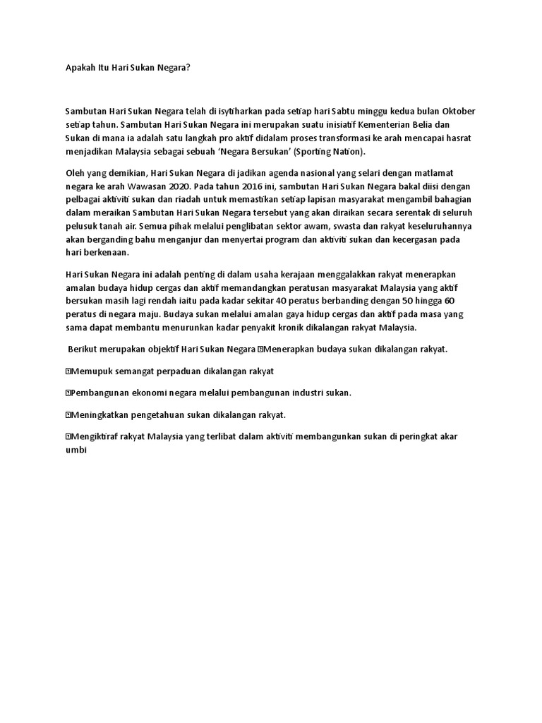 Projek Darul Ehsan Fc Apakah Itu Hari Sukan Negara Sambutan Hari Sukan Negara Telah Di Isytiharkan Pada Setiap Hari Sabtu Minggu Kedua Bulan Oktober Setiap Tahun Sambutan Hari Sukan Negara Ini